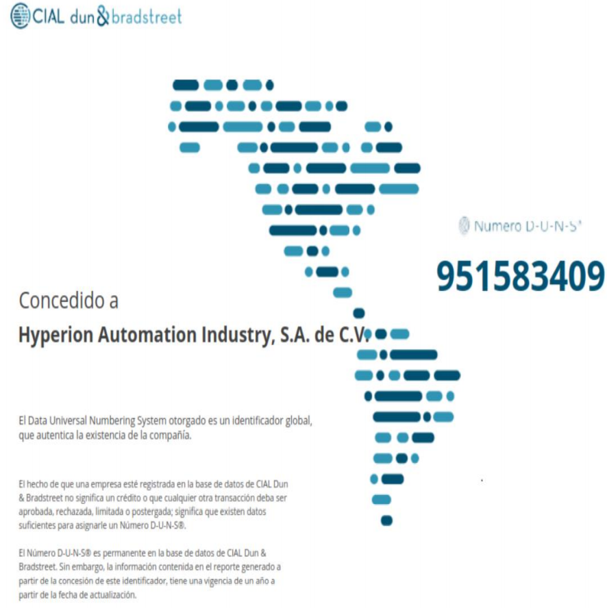 Contamos con numero DUNS registrado y vigente, el cual es un identificador global, que autentica la veracidad y existencia de la compañía. Ver documento