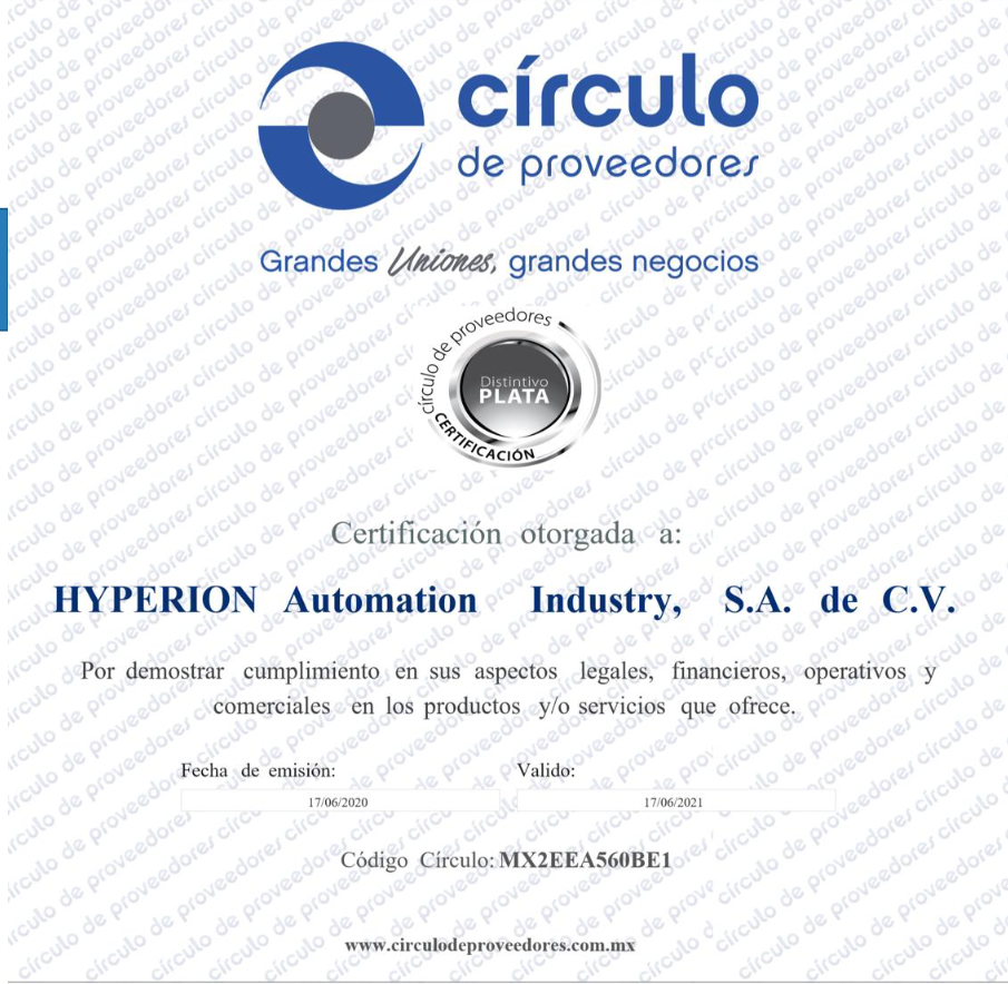 Contamos con certificación plata otorgada por circulo de proveedores, lo que nos hace una empresa 100% confiable para nuestros clientes. Ver documento